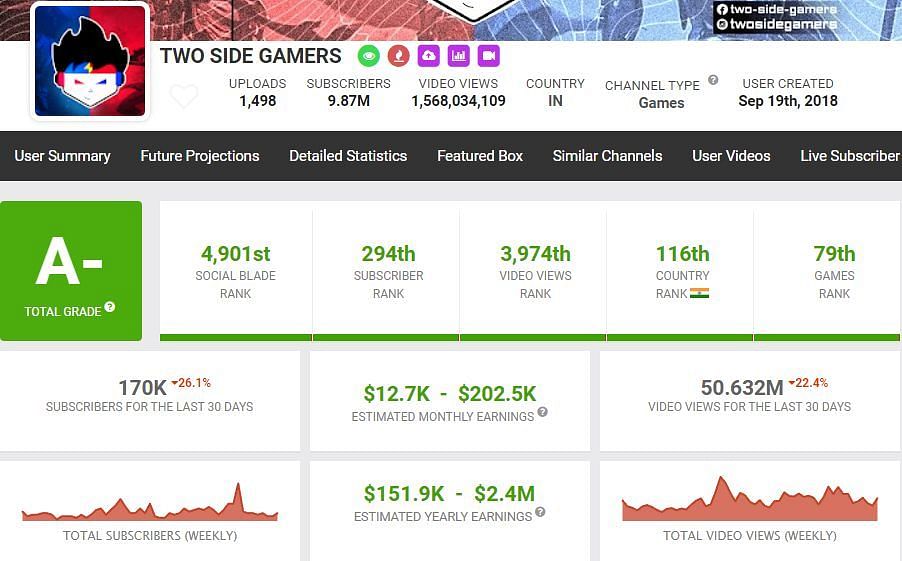 Social Blade website reports that the Two Side Gamers website gains a monthly revenue in the range of $12.7K - $202.5K. The yearly estimates for the income are said to be around $151.9K - $2.4M, given the present level of viewership.
