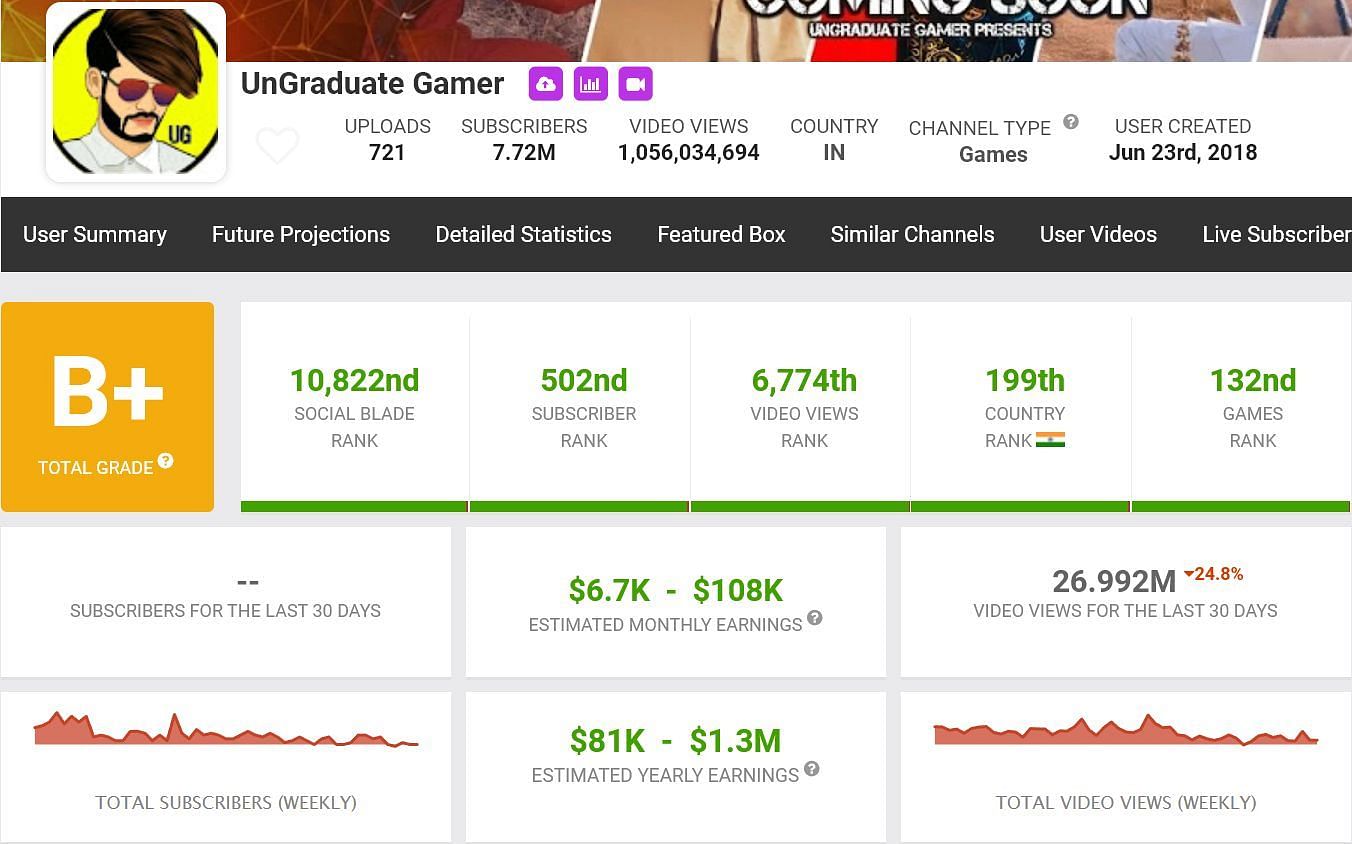 Social Blade puts UnGraduate Gamer's monthly earnings in the range of $6.7K to $108K. The yearly income is expected to be between $81K and $1.3M.