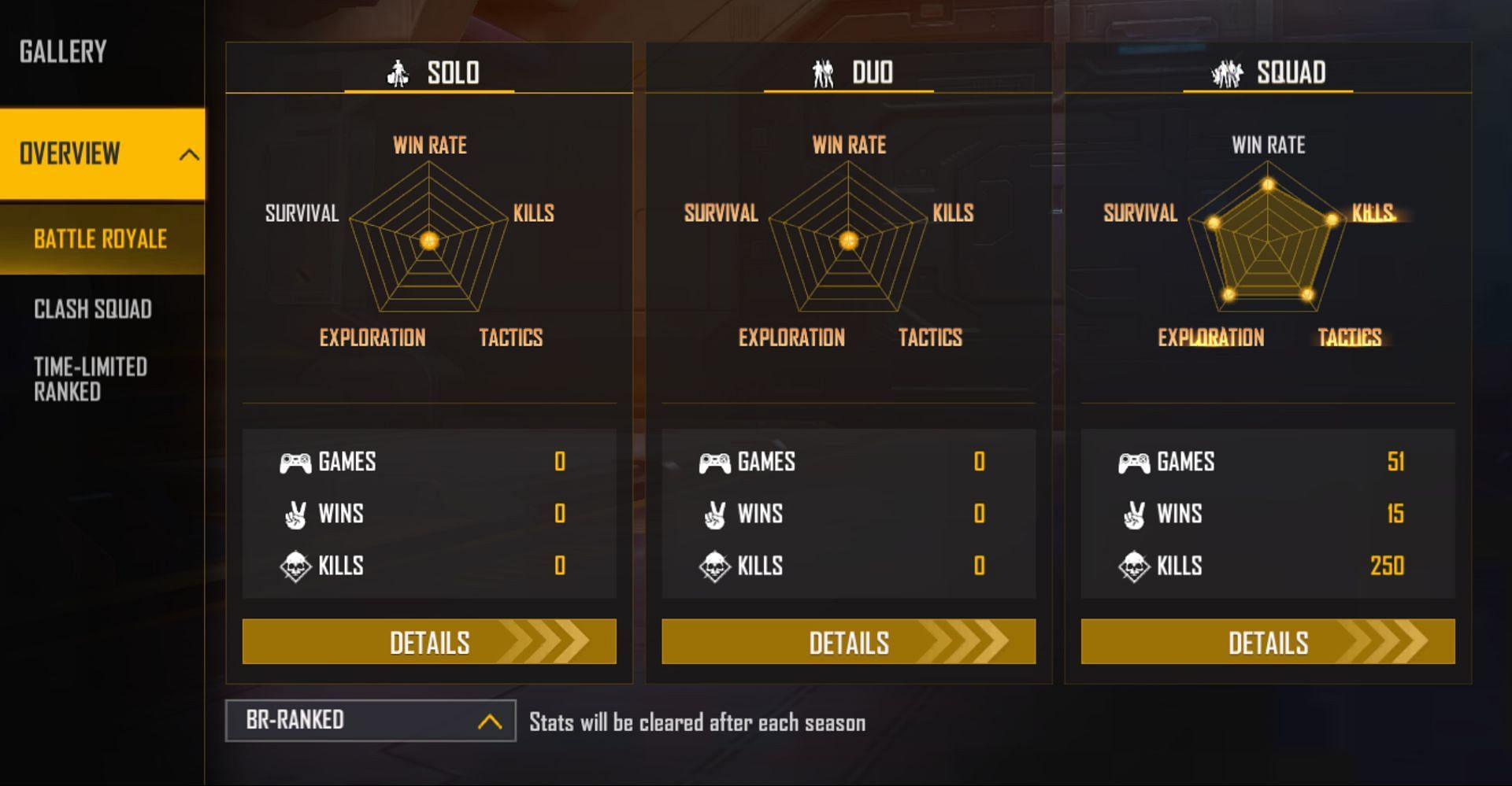 In the current Free Fire MAX ranked season, the streamer has 51 squad matches to his credit, defeating the opposition 15 times for a 29.41% win percentage. Additionally, he has 250 kills in these games, resulting in a K/D ratio of 6.94.