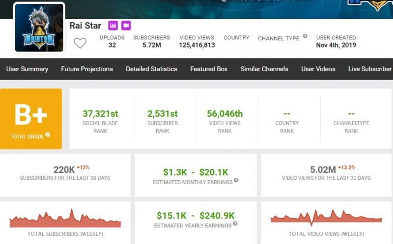 According to the Social Blade website, Raistar is estimated to earn in the range of $1.3K - $20.1K every month. His yearly income lies between $15.1K - $240.9K.