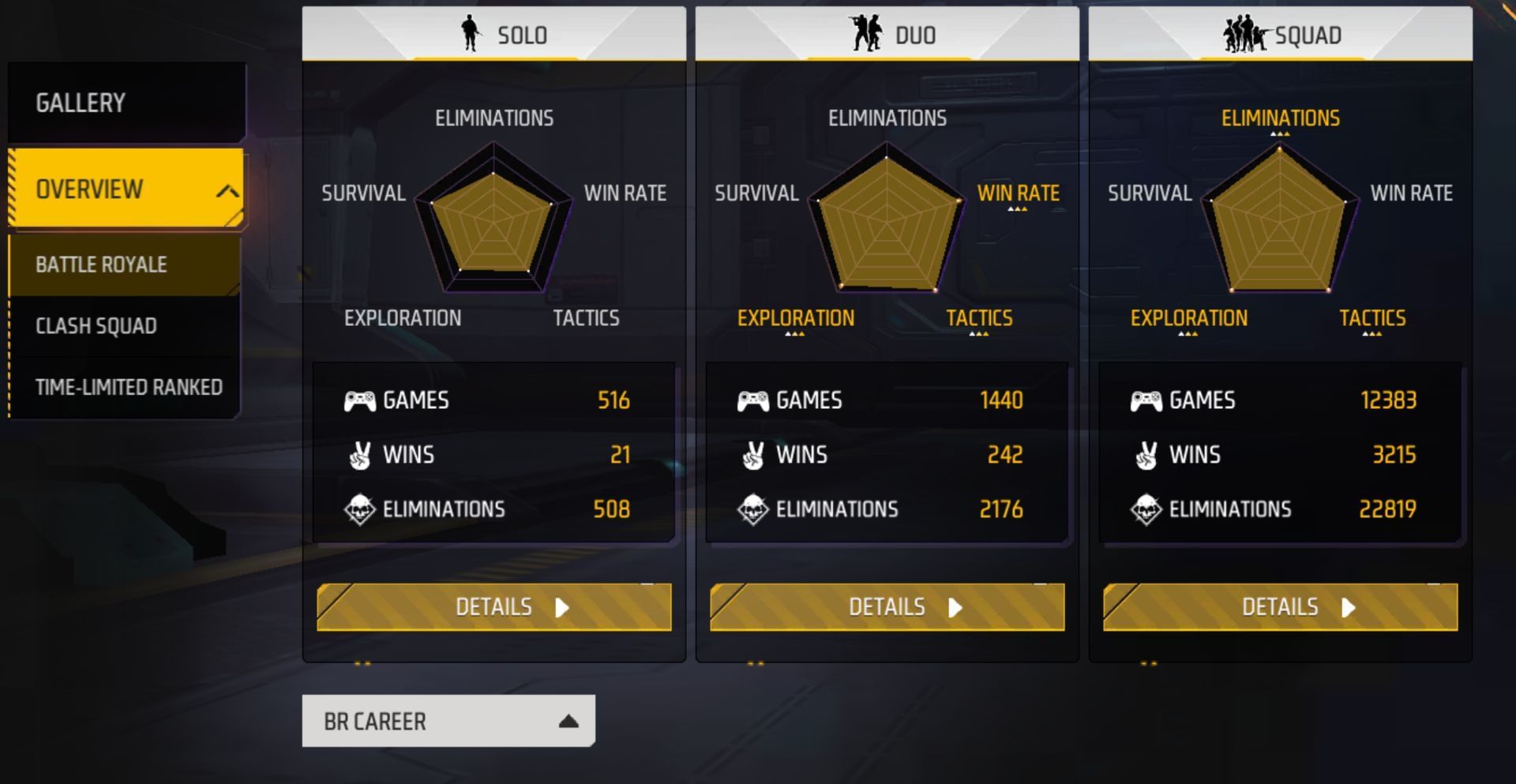 The YouTuber has 242 victories in 1440 duo matches, resulting in a win rate of 16.80%. She has registered 2176 kills at a K/D ratio of 1.82. She also has 454 headshots and a headshot rate of 20.86% to her name.
