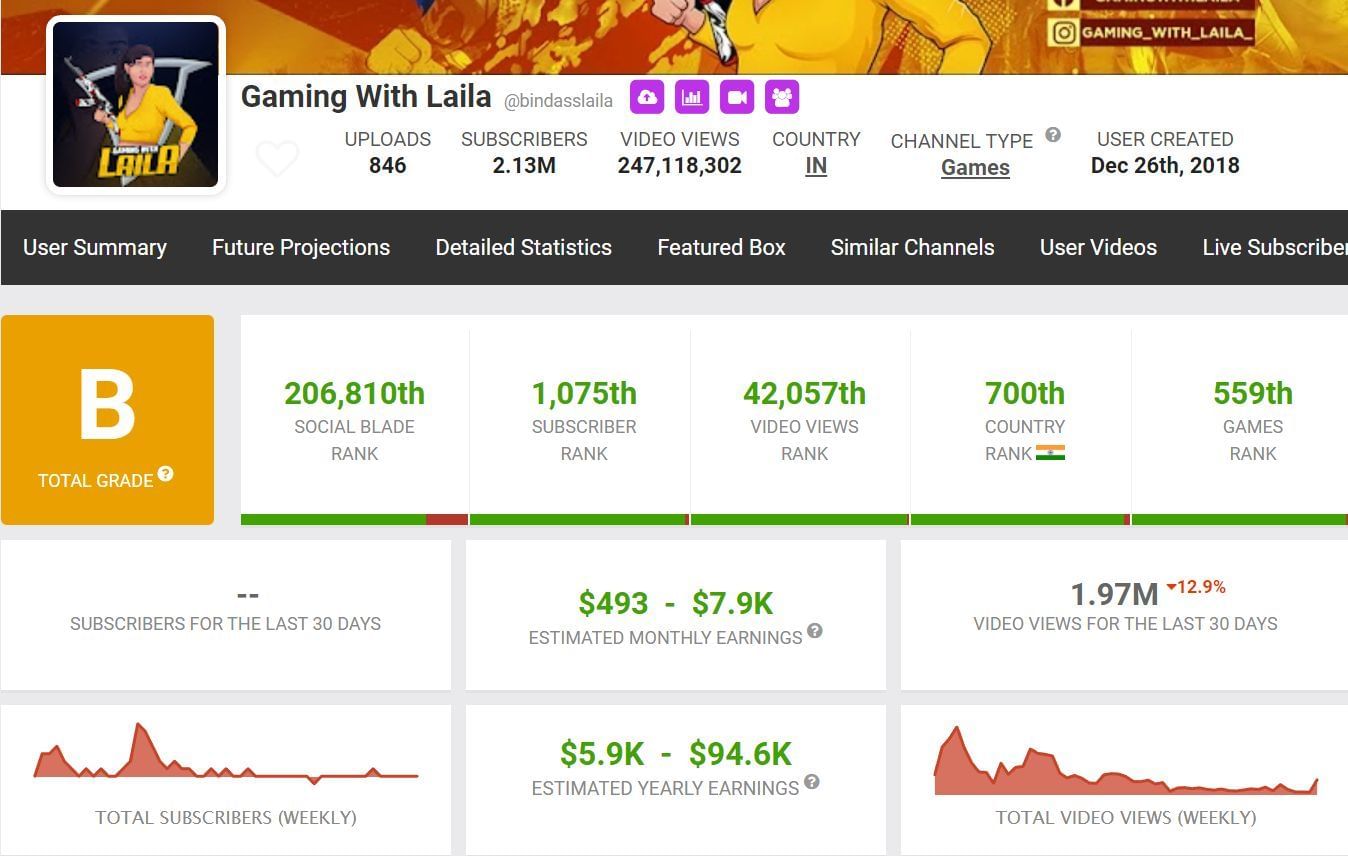 As per a Social Blade report, Mansha Rathore’s monthly income from the Gaming with Laila YouTube channel ranges from $493 to $7.9k. Her yearly revenue from the channel, on the other hand, is between $5.9k and $94.6k.