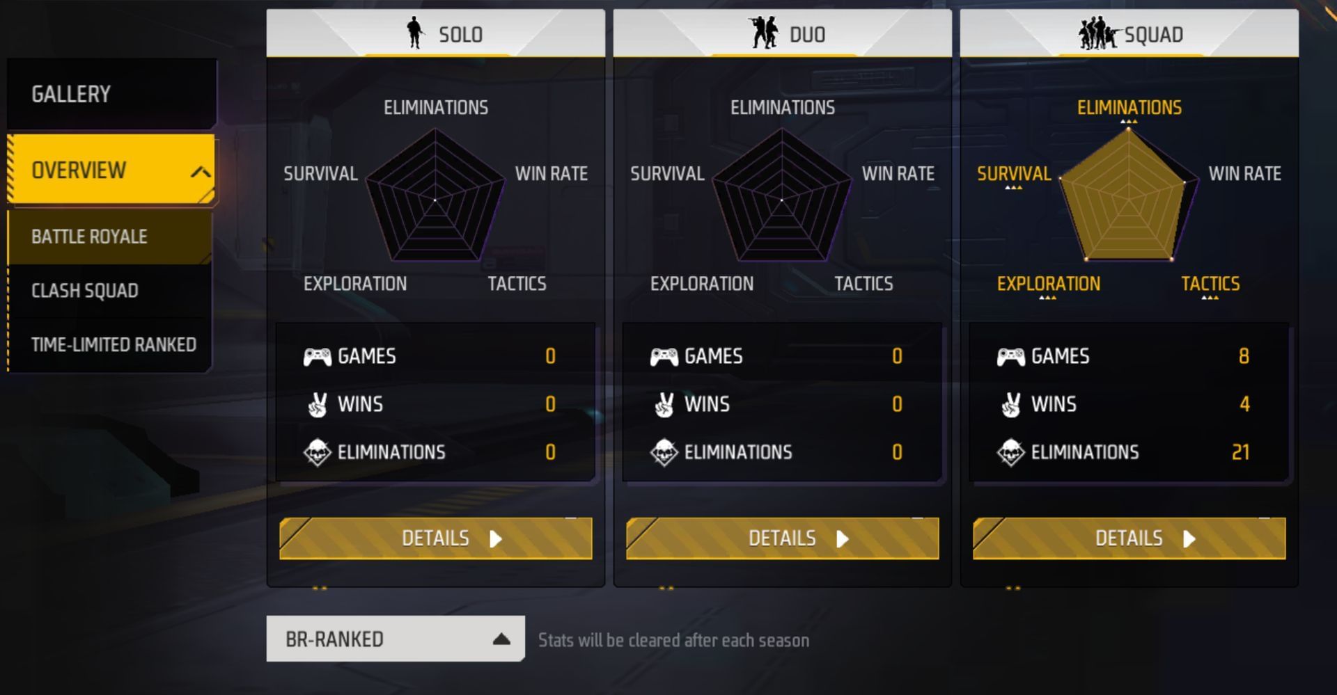 However, the content creator did play eight squad games, and her team won four of them, translating to a win rate of 50.00%. She racked up 21 kills and two headshots for a K/D ratio of 5.25 and a headshot rate of 9.52%.