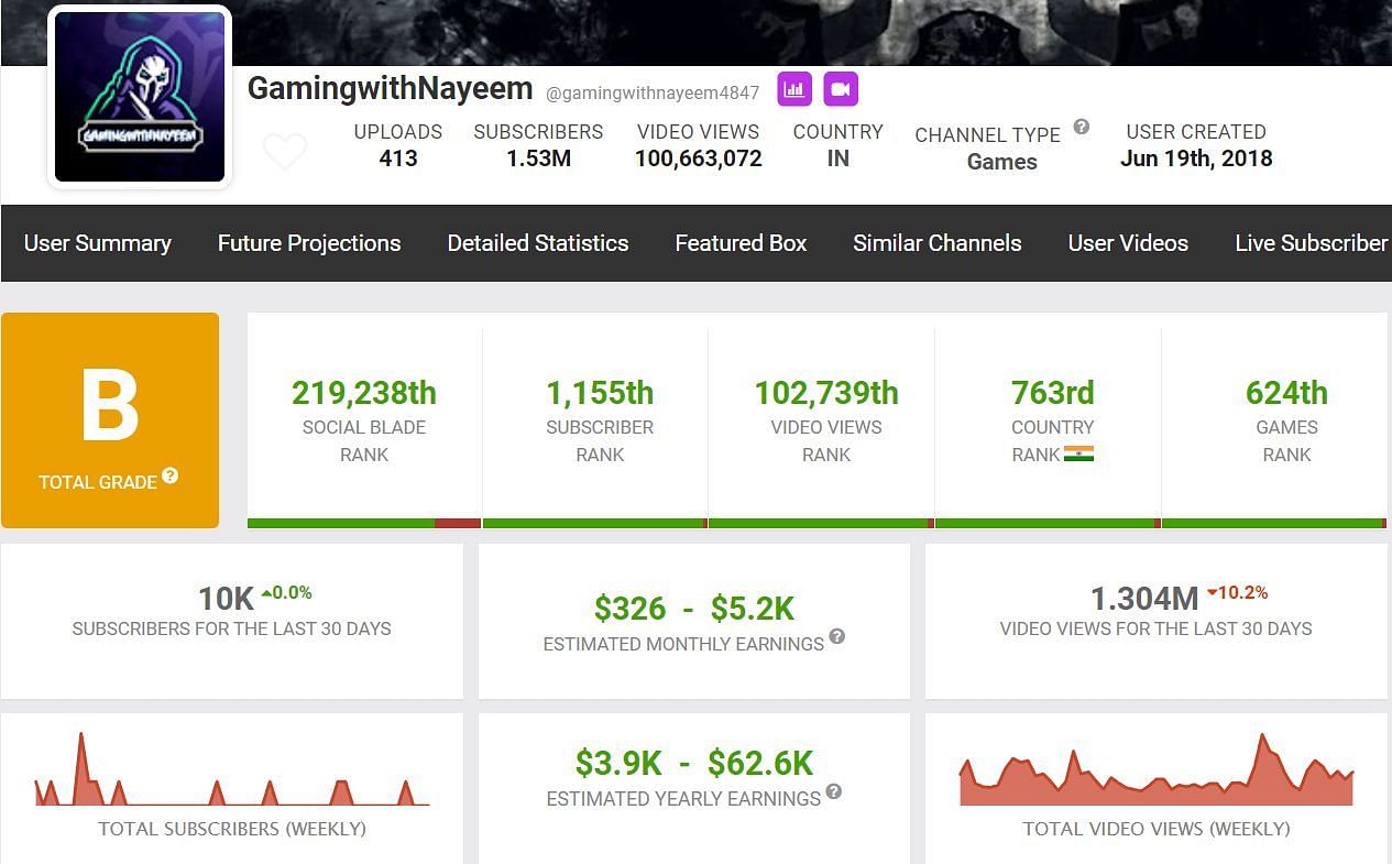The content creator attained 500k subscribers in early 2020, which crossed one million by the start of the following year. Furthermore, social Blade also reports that the GamingwithNayeem channel has attained 10k subscribers and 1.304 million views in the last 30 days.