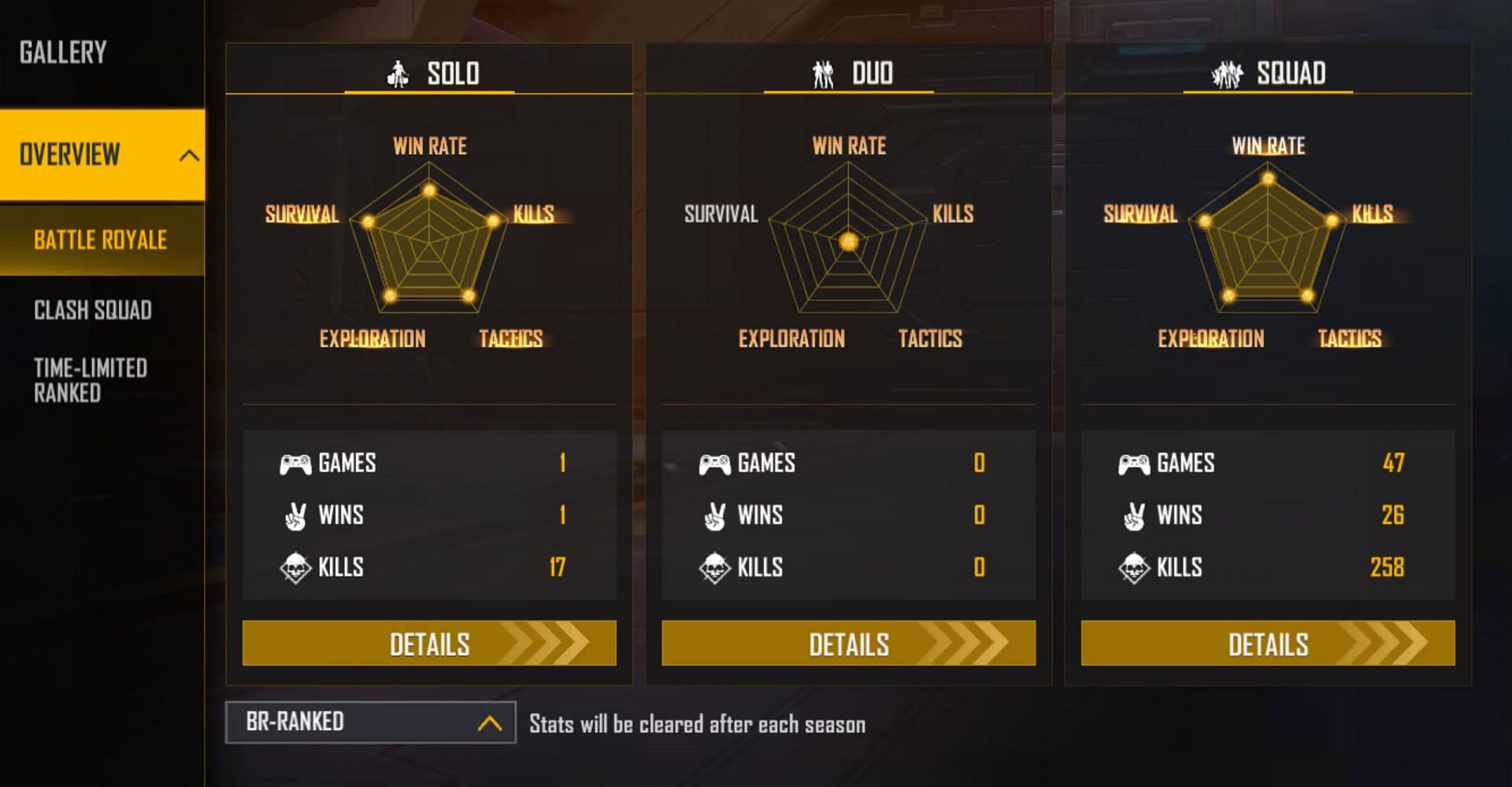 The content creator has participated in a single solo game and has secured the win. He has accumulated 17 kills with 13 headshots for a K/D ratio of 17.00 and a headshot percentage of 76.47%.