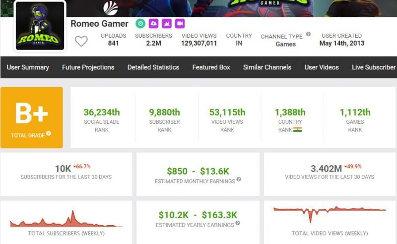 According to the Social Blade website, Romeo Gamer's monthly YouTube earnings are projected to be between $850 and $13.6K. Meanwhile, the annual income is estimated to be around $10.2K and $163.3K.