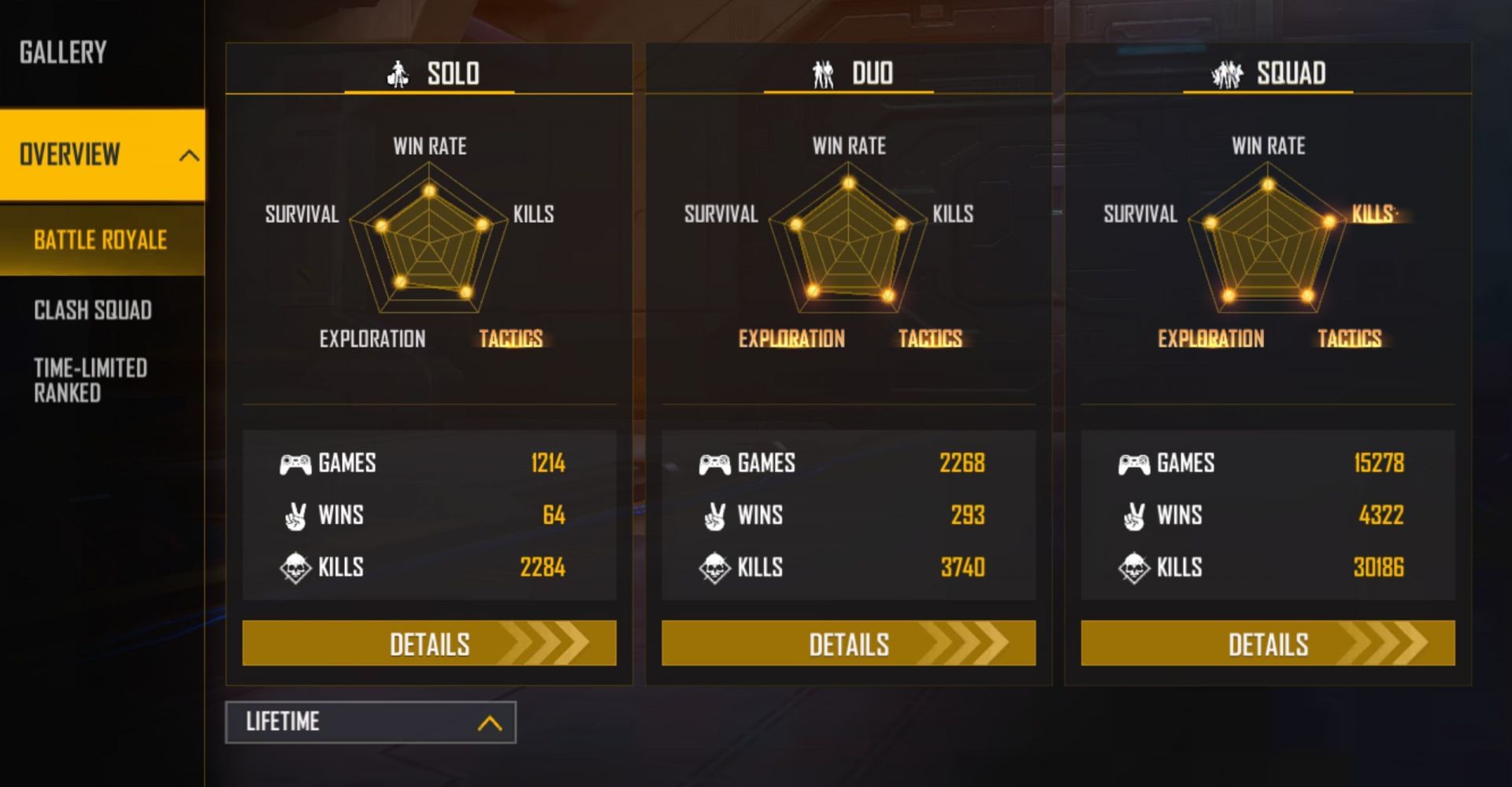 Pavi has participated in 1214 solo matches as well and has remained unbeaten in 64, translating to a win rate of 5.27%. She has 2284 kills at a K/D ratio of 1.99 and 519 headshots for a rate of 22.72%.