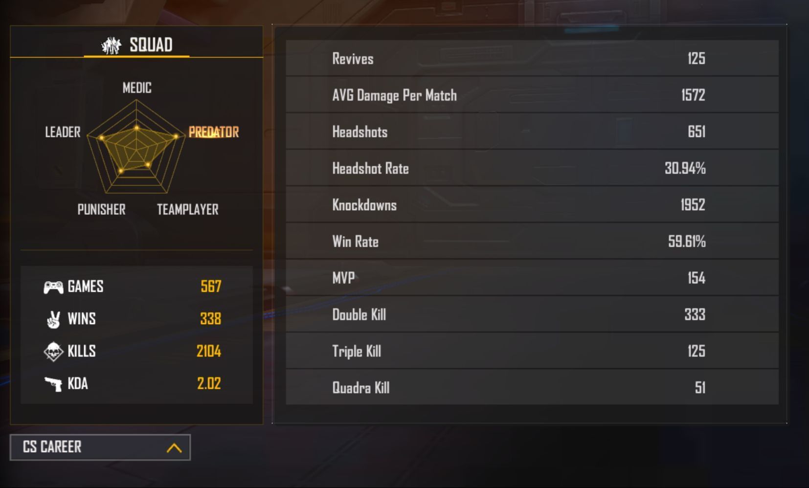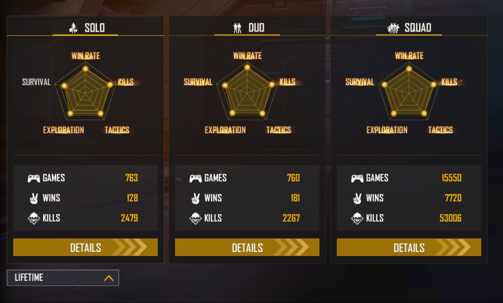 Coming to the solo games, the player has 763 matches to his credit and registered 128 victories, resulting in a win ratio of 16.77%. Skylord has bagged 2479 kills in this mode, corresponding to a K/D ratio of 3.90.