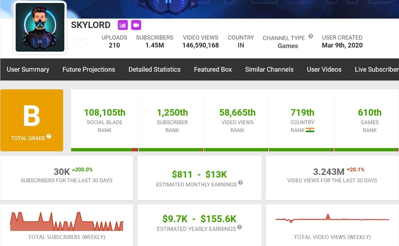 The previous month, Skylord acquired 30k subscribers and received 3.243 million views, which is not small by any means.