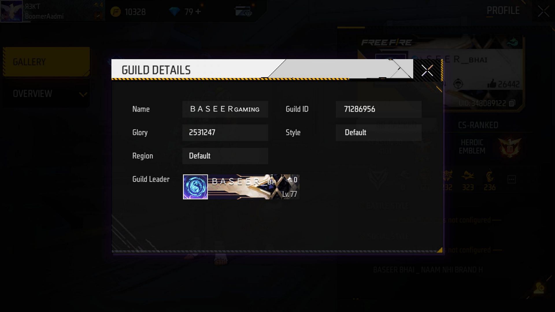 The YouTuber is the leader of the Baseer Gaming guild in Free Fire MAX, whose ID is 71286956. He is ranked Heroic in BR-Ranked Season 30 and Bronze 3 in CS-Ranked Season 16.