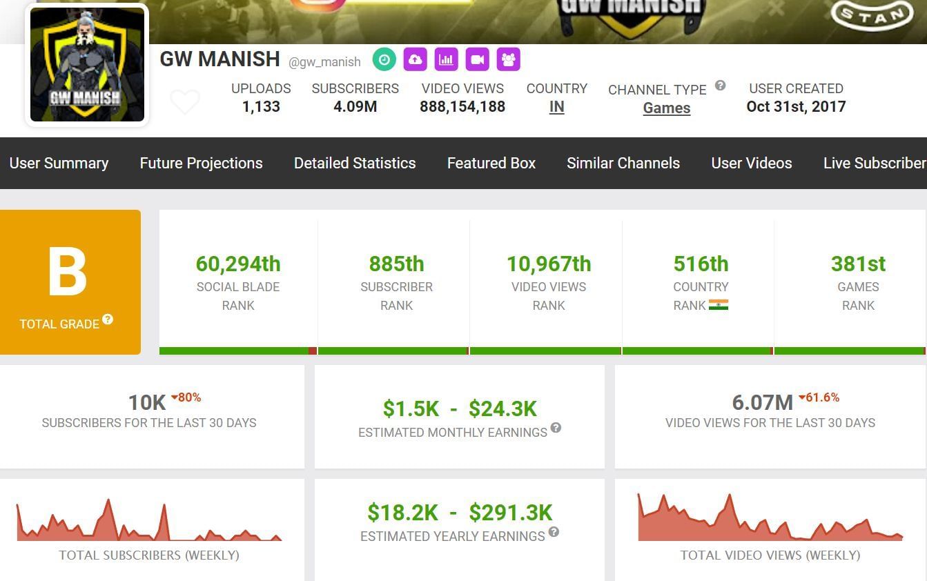 According to the Social Blade website, GW Manish’s estimated monthly income via his main YouTube channel lies between $1.5K and $24.3K. On the other hand, his projected yearly earnings range from $18.2K to $291.3K.
