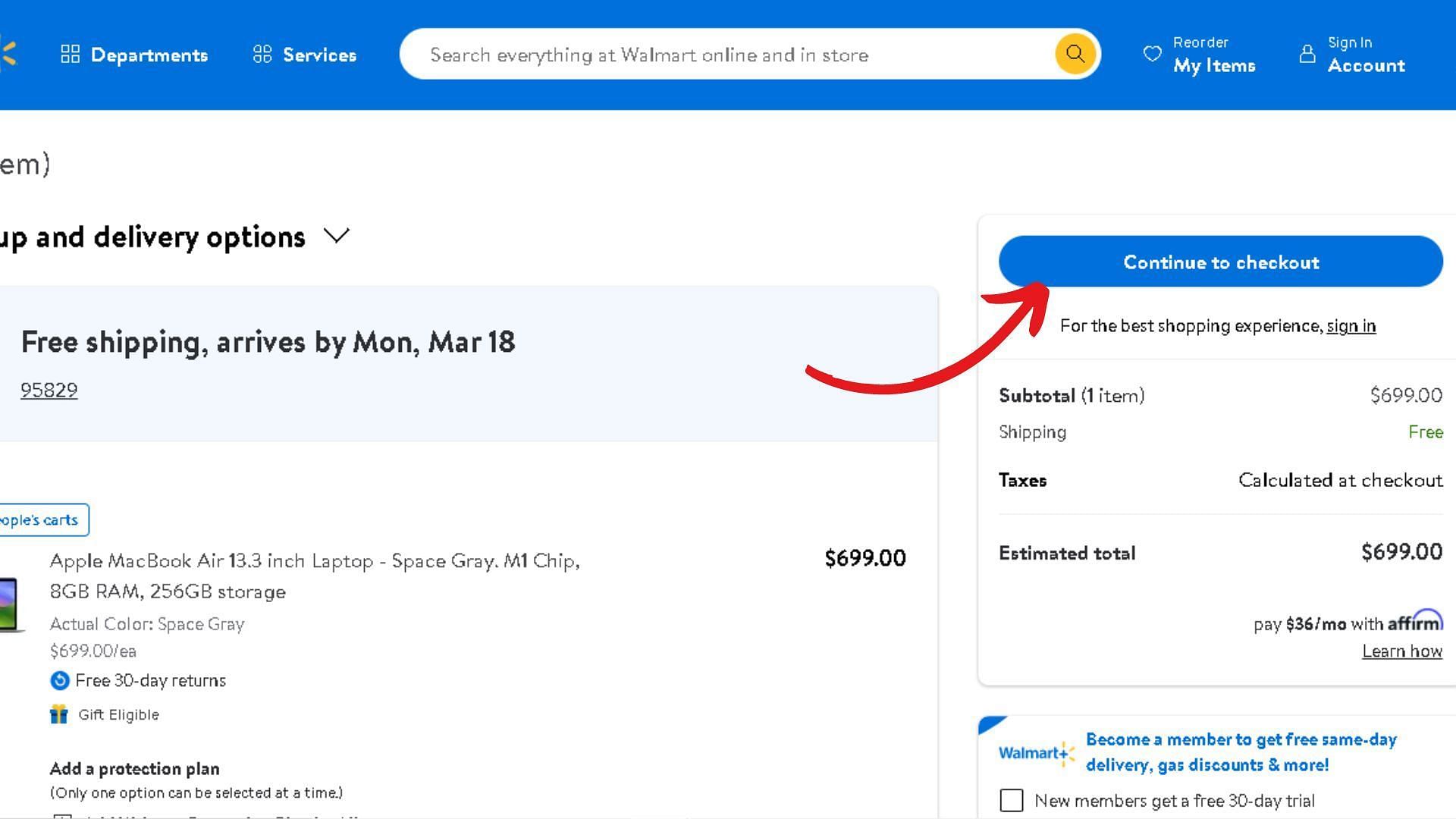 Go to Walmart's official website. You will see a banner on the website's homepage displaying the latest offer on the M1 Air. Click on the Shop Now button from the bottom of the promotional banner.