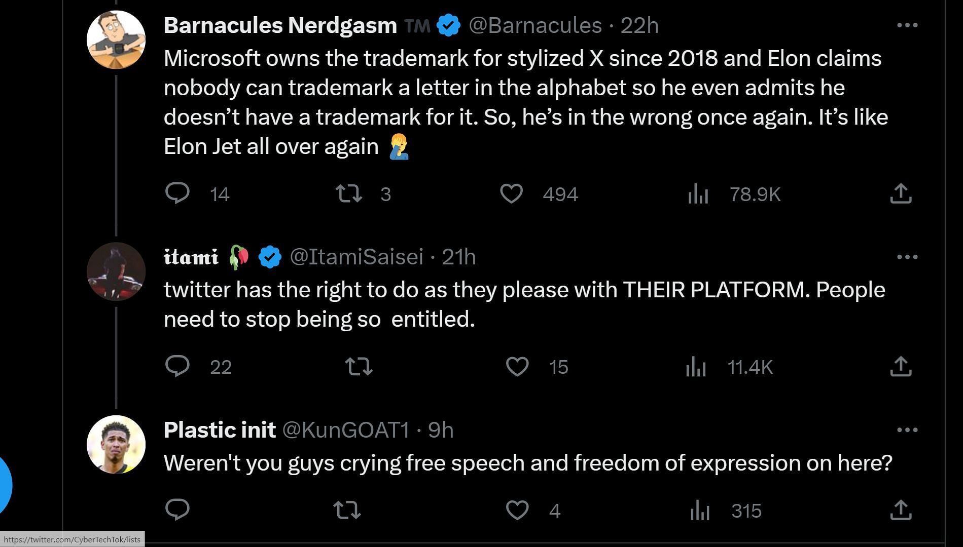 However, some have countered this point: Microsoft allegedly owns the trademark for a stylized X since 2018, and Elon Musk had previously claimed that a letter cannot be trademarked. This has led to further arguments and counterarguments on the platform.