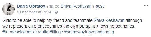 Obratov, who had finished 25th in the Nations Cup, was happy to have been able to help her friend even though he comes from a different nation. She wrote on her Facebook page: