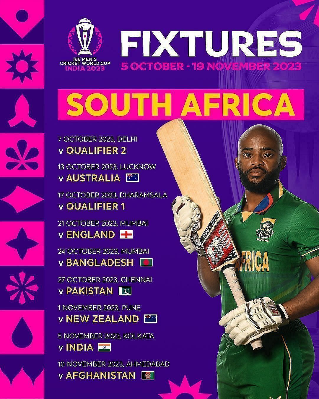 | October 24, 2023 | South Africa v Bangladesh | 02:00 PM | Wankhede Stadium, Mumbai |