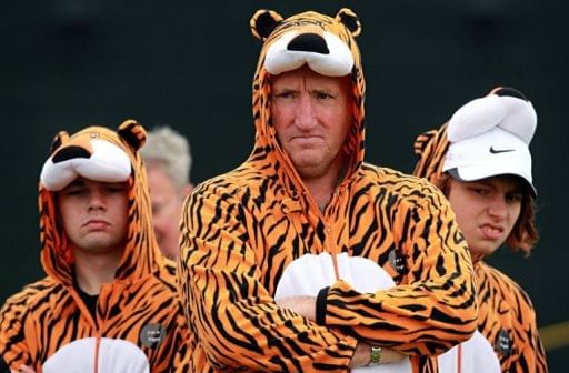 Golf spectators wearing tiger suits wait for Tiger Woods of the US at Royal Lytham and St Annes in Lytham, north-west England, ahead of the 2012 British Open Golf Championship which begins on July 19.
