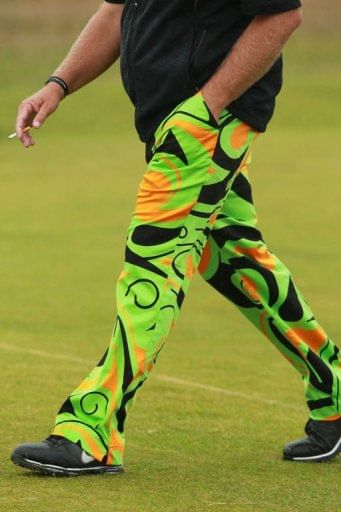 John Daly of US wearing bright trousers during a practice round for the 2012 British Open Golf Championship at Royal Lytham and St Annes in Lytham, north-west England, ahead of the Open Championship which begins on July 19.