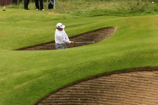 Graeme McDowell of Northern Ireland plays out of a bunker on the ninth hole at Royal Lytham and St Annes in Lytham, north-west England, ahead of the 2012 British Open Golf Championship which begins on July 19.