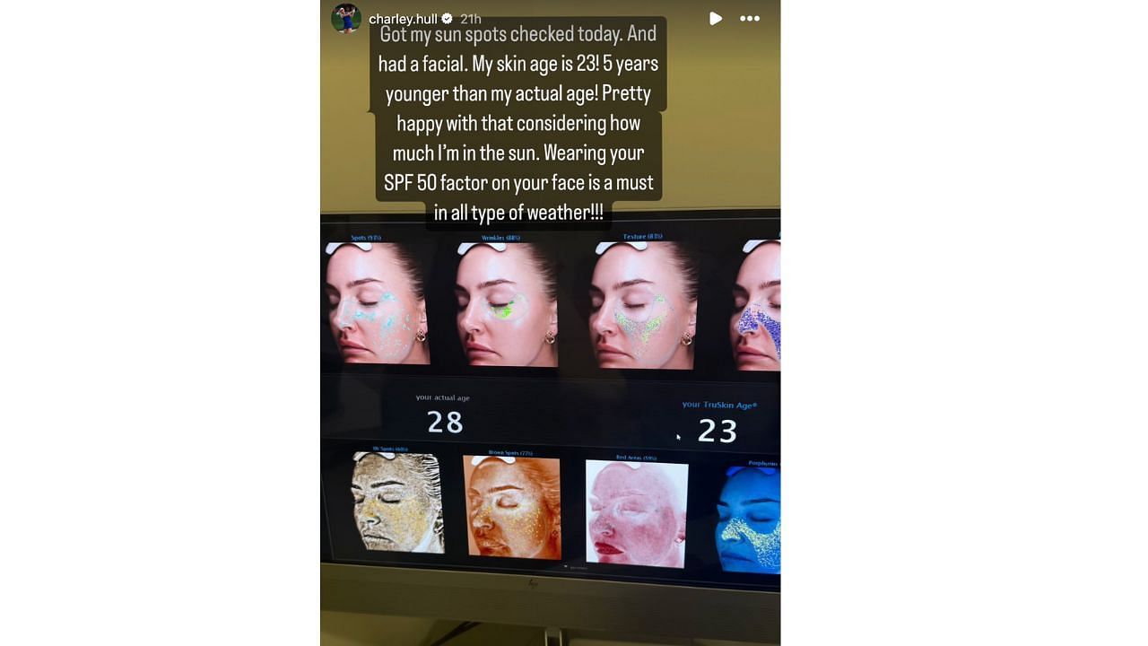 She added in the caption: "Got my sun spots checked today. And had a facial. My skin age is 23! 5 years younger than my actual age! Pretty happy with that considering how much I'm in the sun. Wearing your SPF 50 factor on your face is a must in all type of weather!!!"