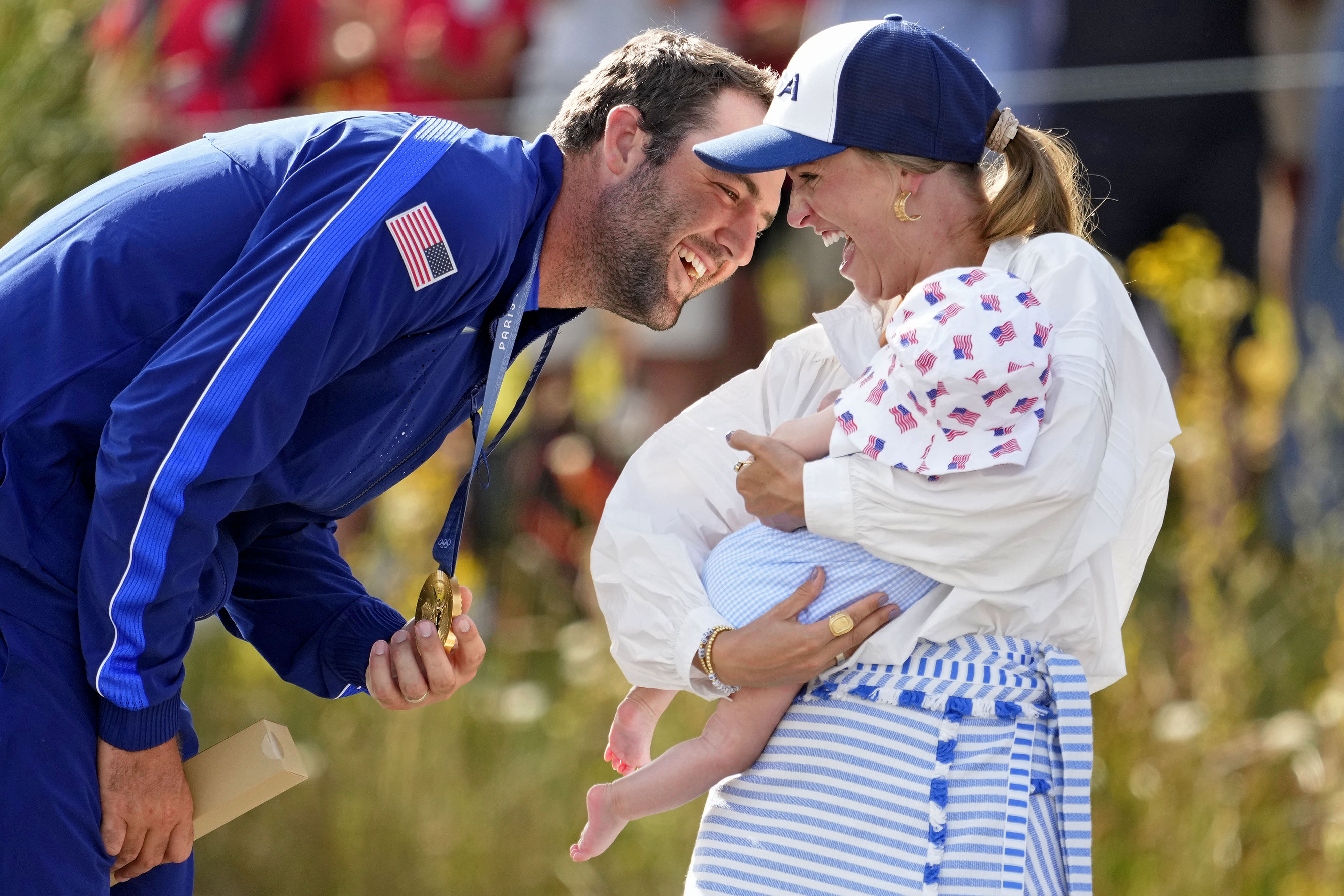 Scottie Scheffler celebrating his Paris Olympics win with wife and son (Image Source: Imagn)