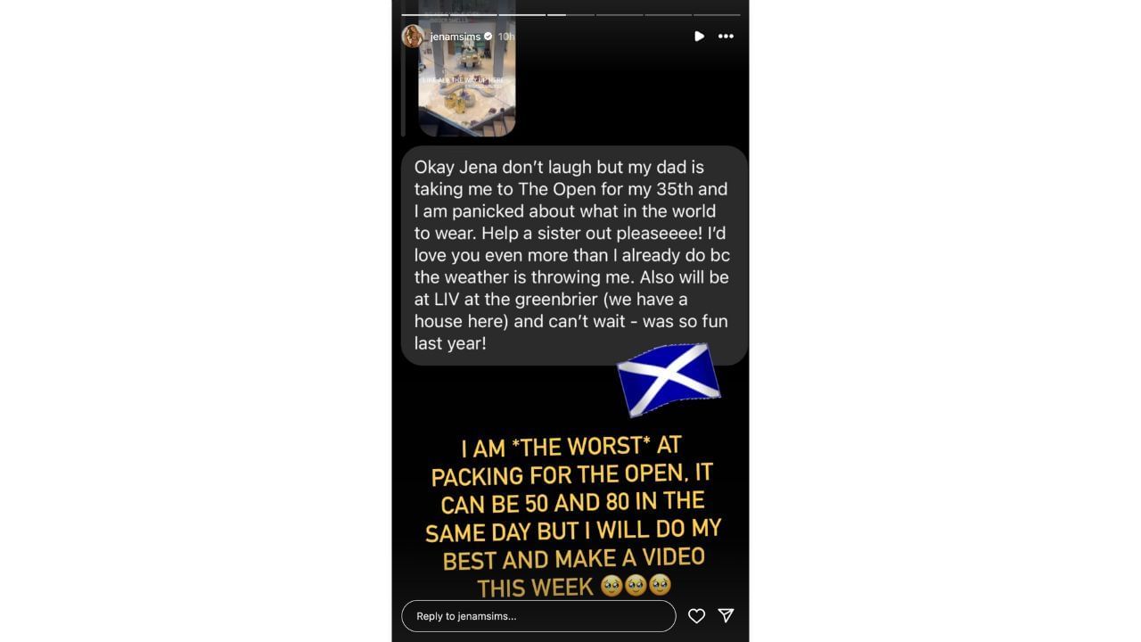 A fan shared with Sims that she was going to be at the Open Championship too. The fan's father is planning to take her for a 35th birthday, but she has no idea what to wear. The weather is tough to plan for, and the fan sought the help of someone fashionable who's been in the situation before.