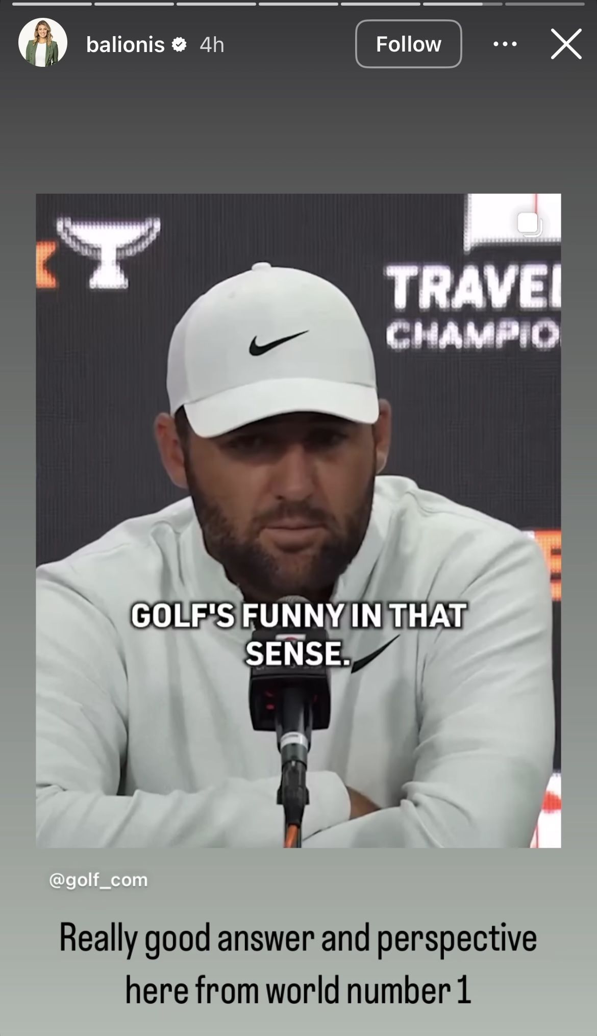Popular CBS Sports reporter Amanda Balionis reposted a clip of Scheffler’s interview on her Instagram story, writing,