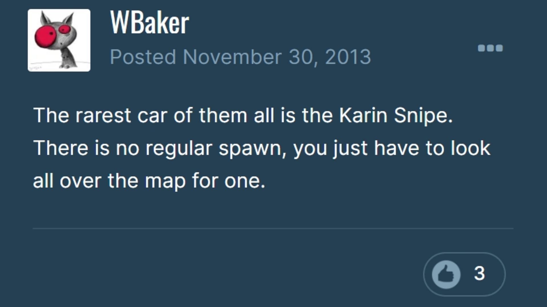 There's no vehicle called the Karin Snipe in GTA Online; it was meant as a hoax to troll players. The name itself is a reference to the "snipe hunt," a practical joke where the victim is made to believe in a mythical animal called the snipe. The victim is then encouraged to find and hunt down this creature.