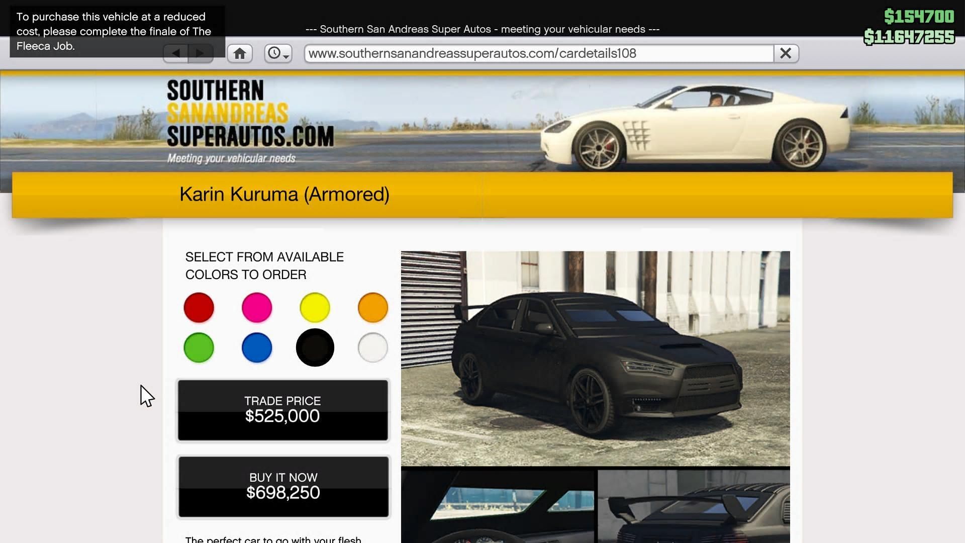 Another great aspect about the Armored Kuruma is its price. Many armored vehicles in GTA Online cost millions, but not this one. It has a base price of only $698,250 on the Southern San Andreas Super Autos website. Furthermore, those who complete the Fleeca Job can buy it for just $525,000.