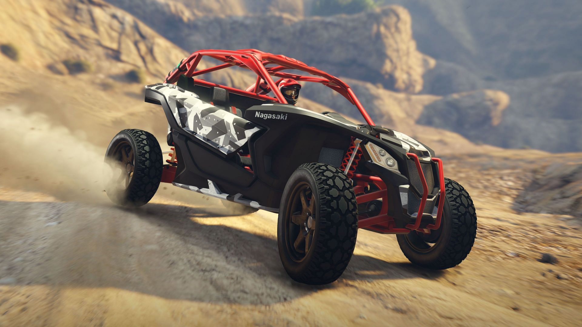 The Nagasaki Outlaw is an off-road vehicle, and a pretty good one at that. Its engine is powerful, the tires hold a tight grip with the surface, and the car maintains great balance on uneven terrain. In short, Outlaw is a fun vehicle for exploring Chiliad Mountain State Wilderness.