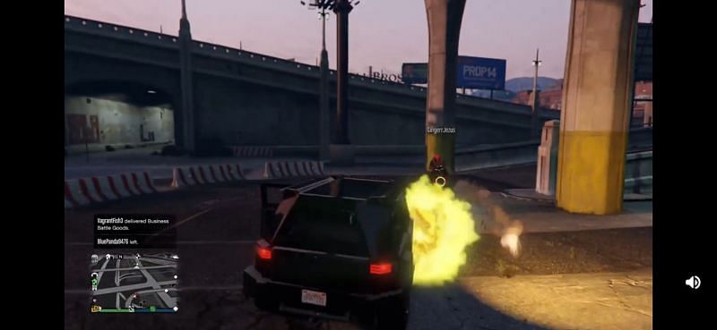 The moment he steps out of the mod shop, he has a surprise waiting for him. A griefer riding an Oppressor Mk 2 attacks him, firing rockets on his Nightshark.