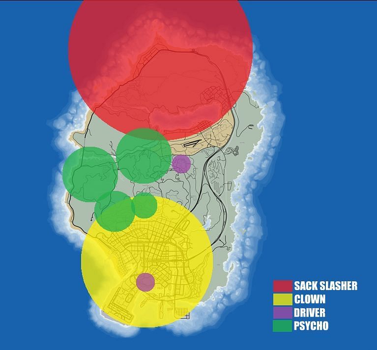 Although they get one zone each, Sack Slasher and Clown are the easiest to spawn because their zone radii are massive. Psycho gets a fair chance of spawning with four zones, concentrated around South-Western Blaine County. On the other hand, Driver is the most difficult to meet, as he only spawns in specific locations. One of these is in Blaine County, while the other is in Los Santos.
