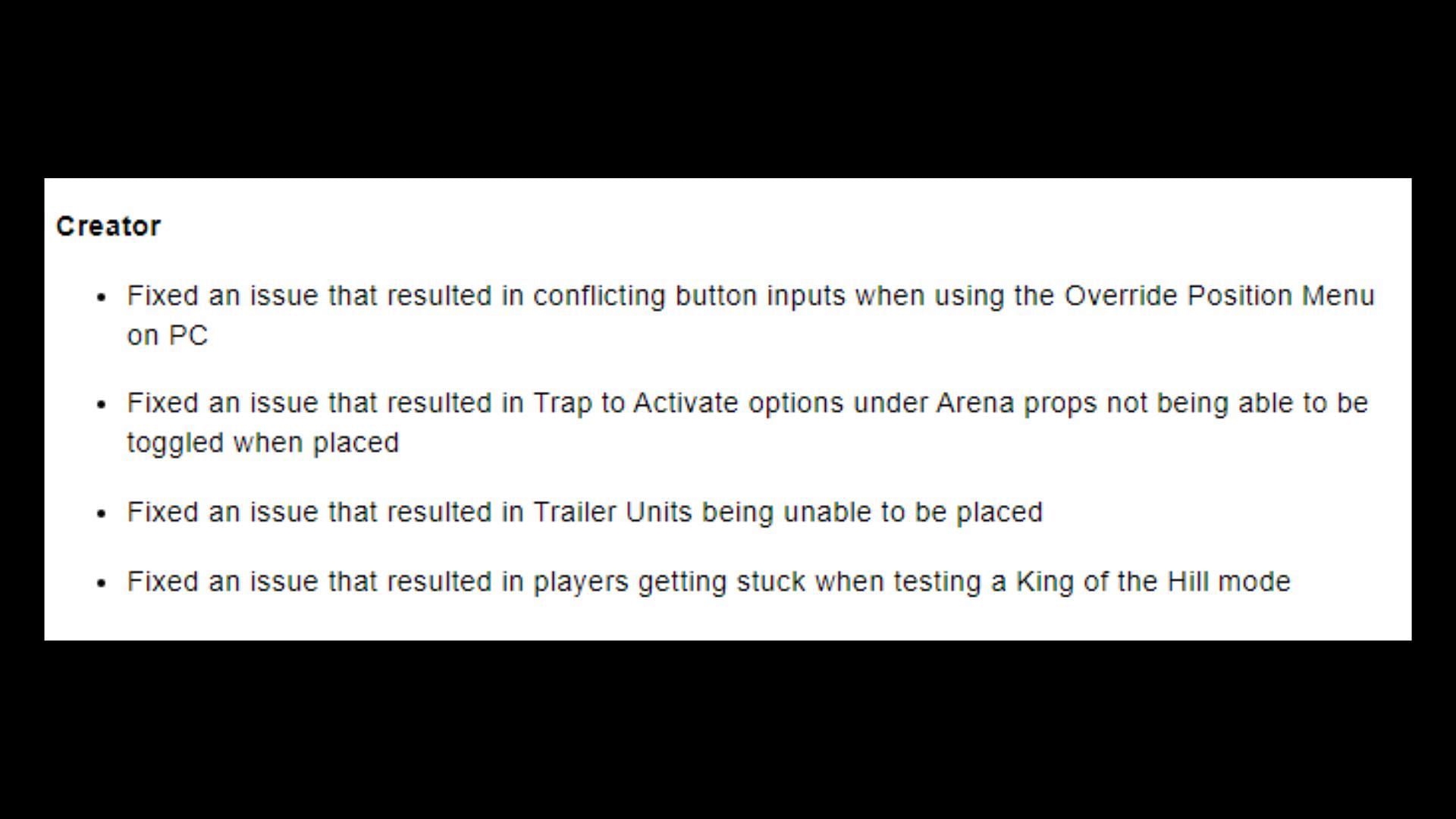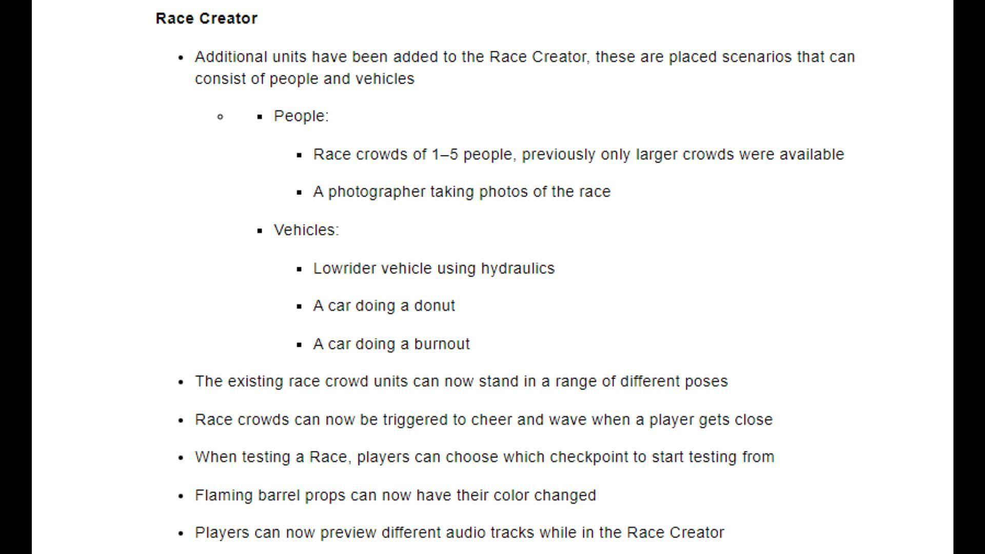 More than 150 and 200 clothing and accessories have been added for male and female characters, respectively. Creator mode received new tools, props, and upgrades, the ability to make custom Drift and Drag Races, and Race Creator got new units.