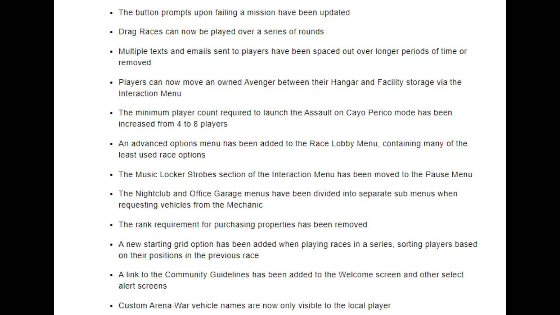 Here are some notable points from the latest GTA Online patch notes (1.69 update)