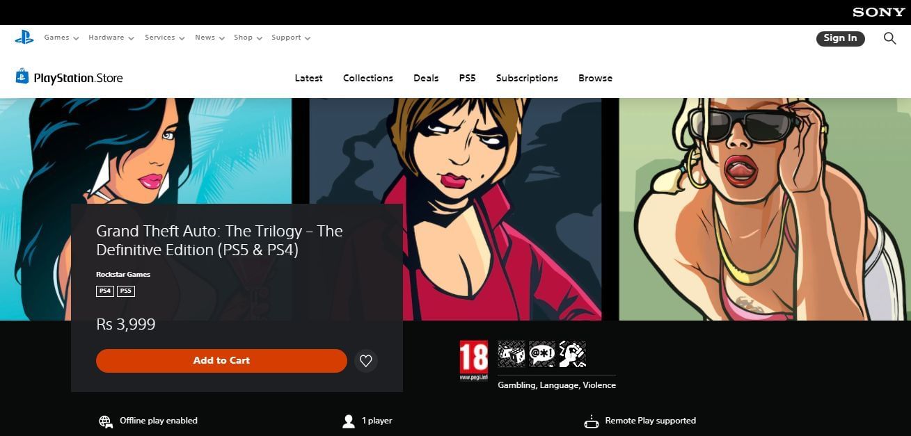 - Here, players must select the Add to Cart button to purchase the game. The PS Store can also be visited from the PlayStation console itself. Once the purchase is made, the GTA Definitive Edition Trilogy will be added to the player's library.