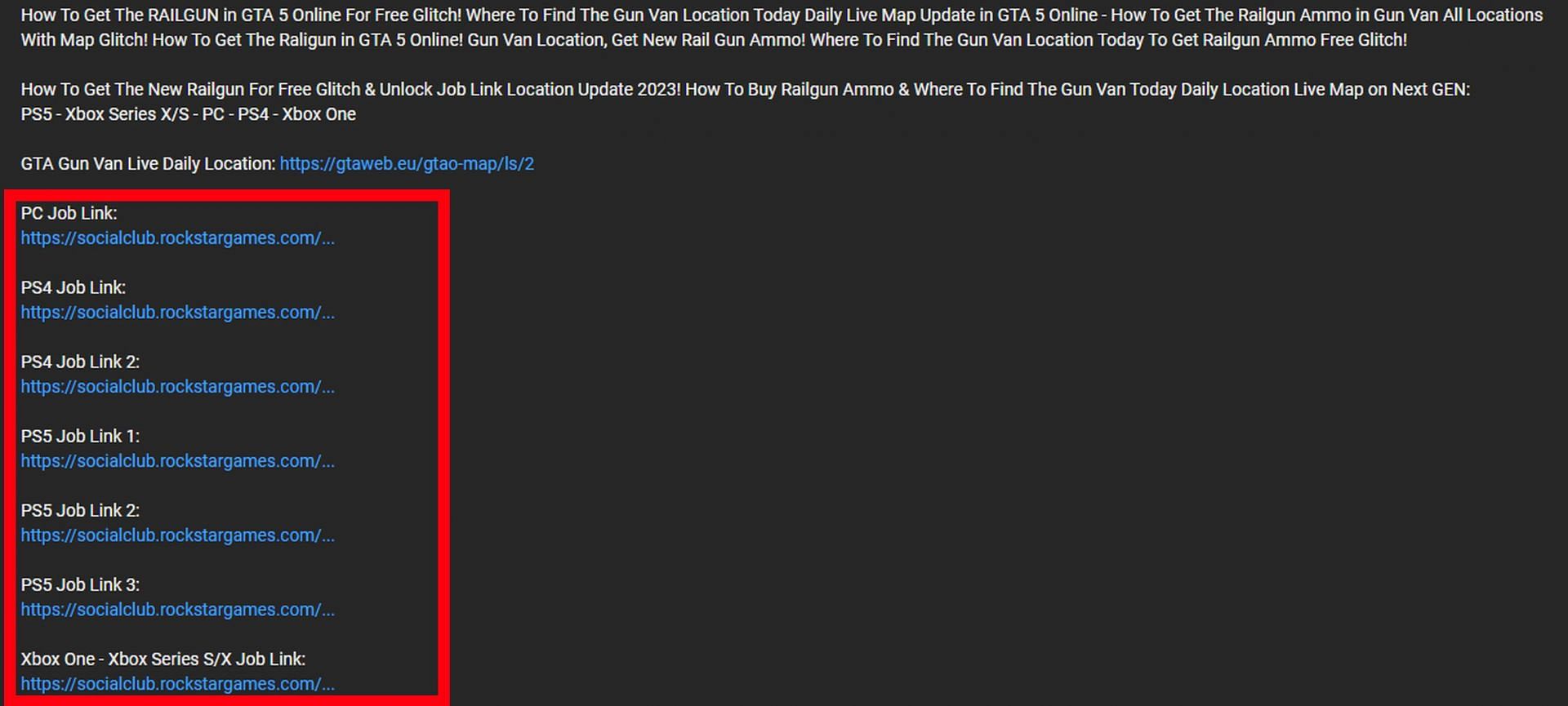 While the PC hyperlink is noted to not work, the rest are available as of the time this article was written. Step #1 to get a free Railgun in GTA Online is to bookmark the job from any of the hyperlinks shown below.