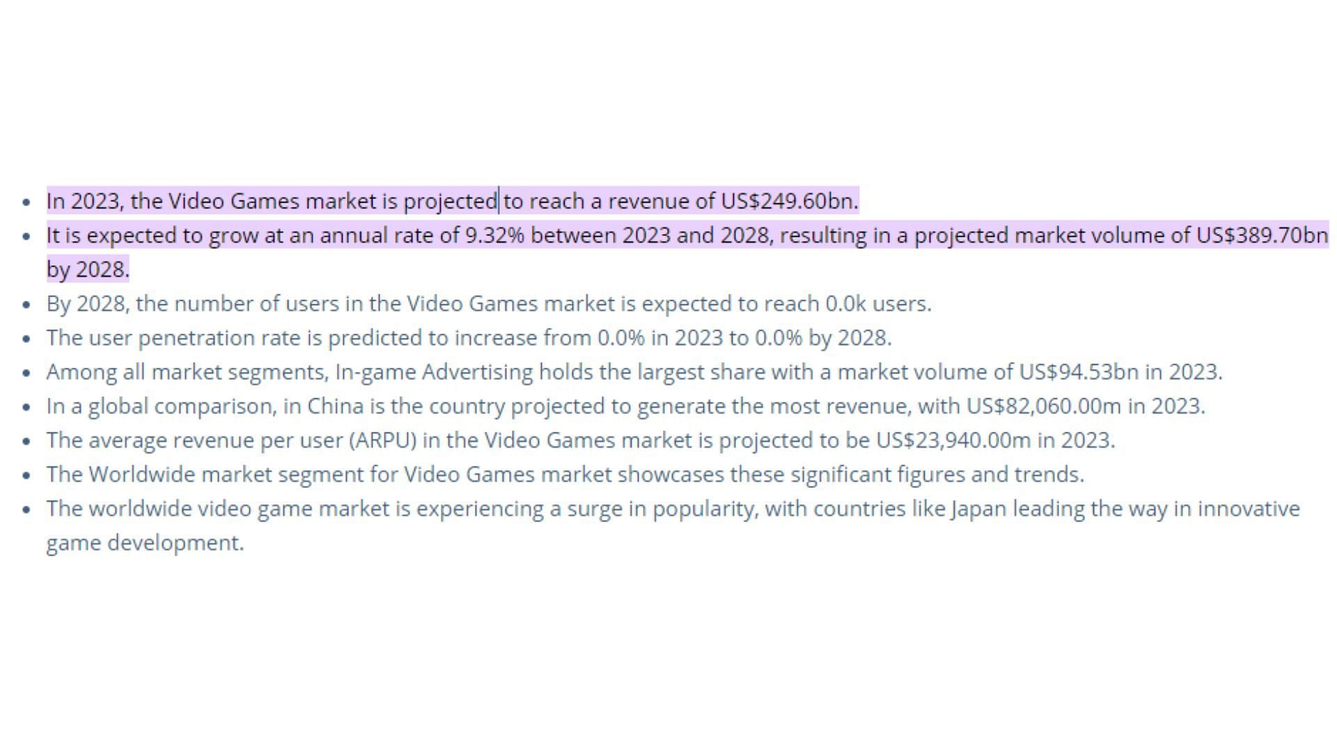 Williams’ claims are supported by a report from Statista, which estimates that the video game market will reach $249.60 billion in revenue in 2023 and $389.70 billion by 2028.