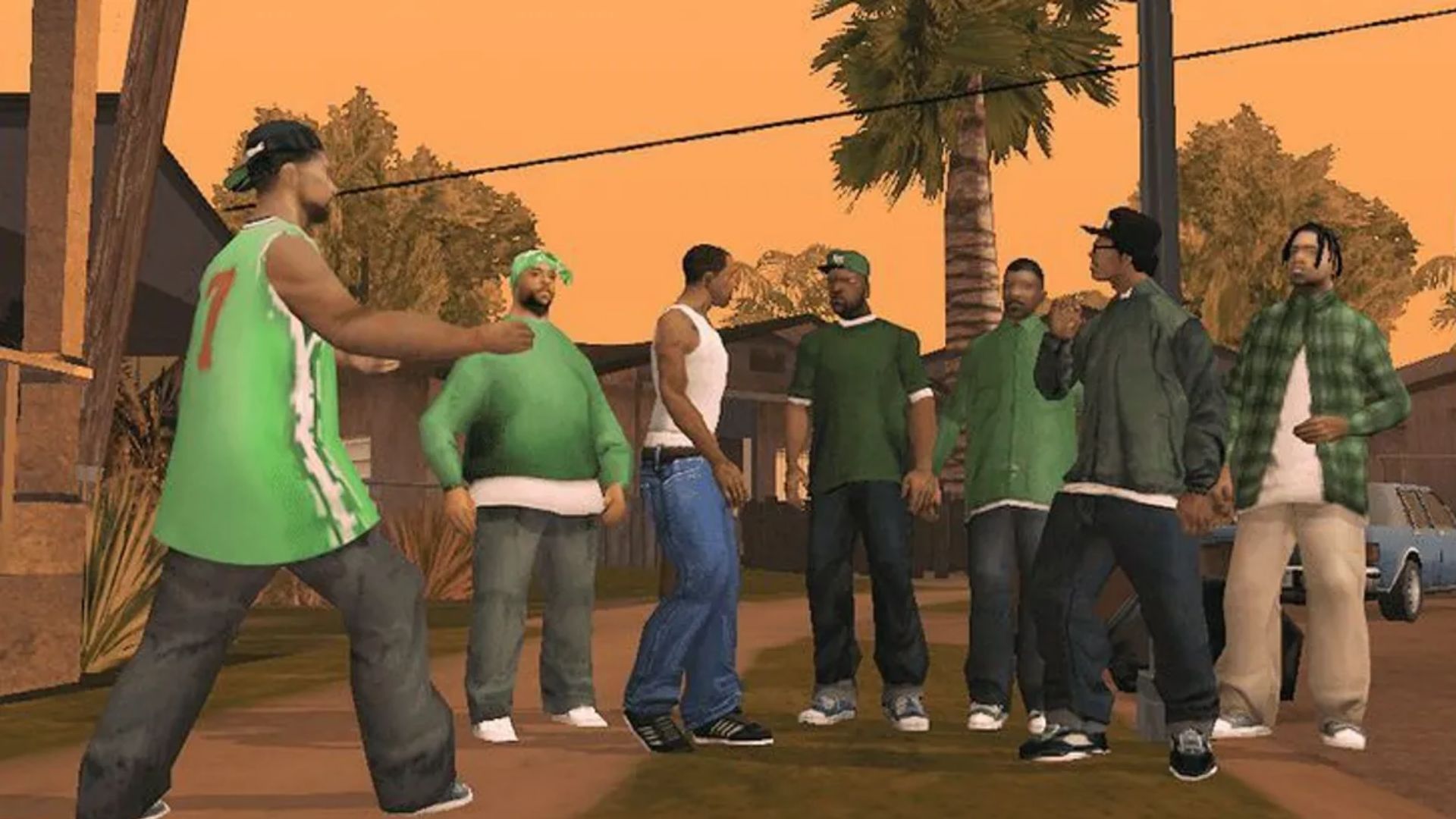 These old memories would include cutscenes from the original game with the default graphics. CJ shakes his head disapprovingly after remembering some classic banter with Ryder and Big Smoke before he finally makes it to Grove Street.