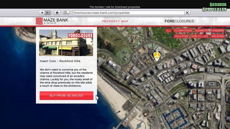 The Insert coin arcade can be bought from the Maze Bank Foreclosures website for $2,345,000 and its located at Rockford Hills in GTA Online. It's usually preferred by players as it is located next to most other businesses and can help them rack up a lot of money.