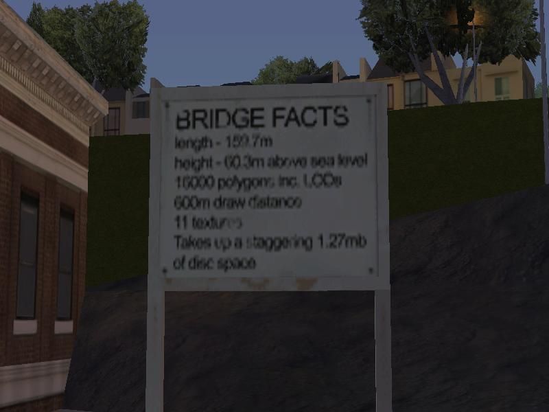 This secret is a sign with various Gant Bridge facts. Some of the facts include "15,000 polygons, inc. LOD" and "Takes up a staggering 1.27 MB of disc space."