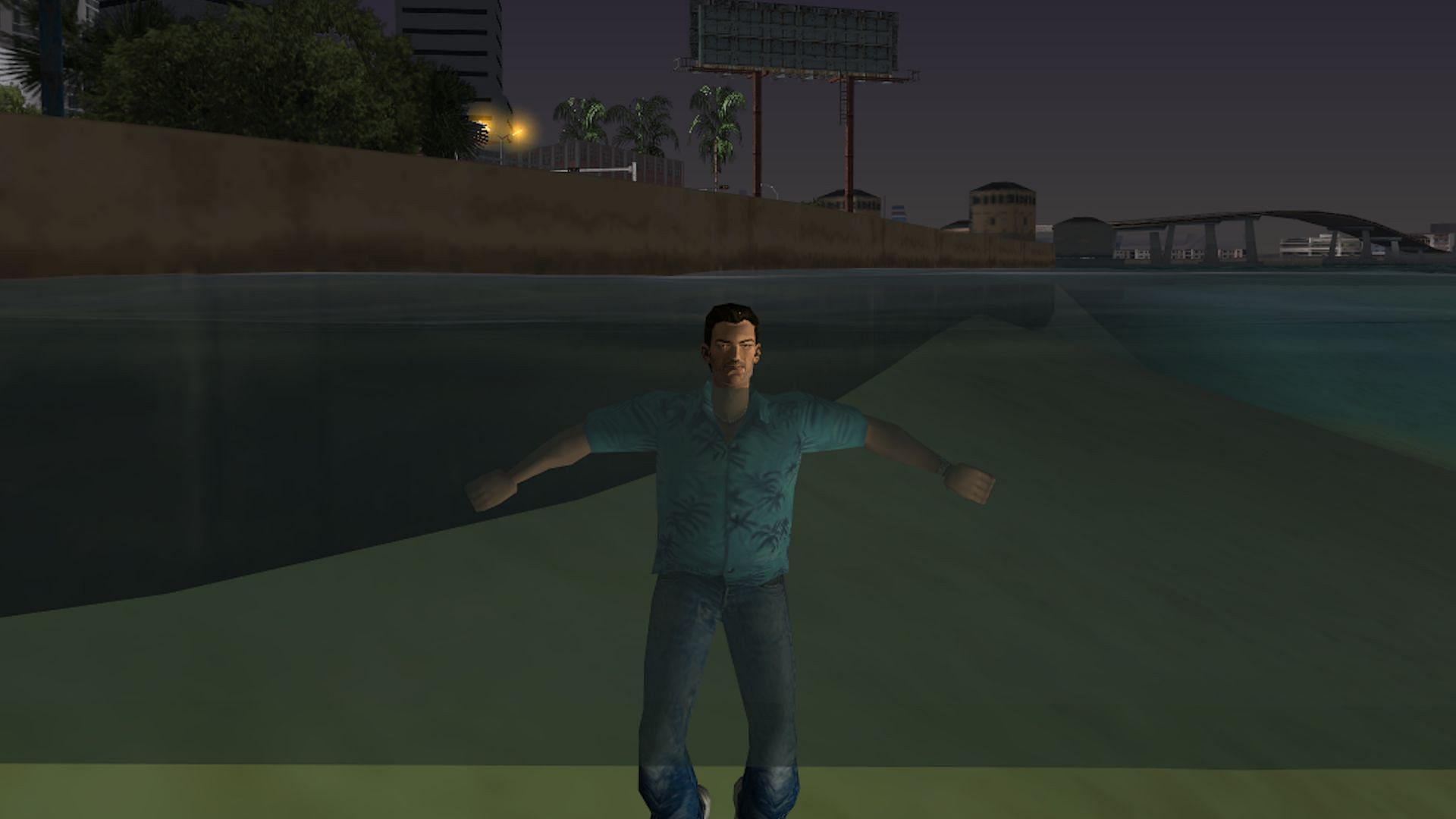 Several GTA Vice City mods allow him to finally swim. The one shown here is based on VCS's swimming mechanic. Tommy Vercetti can now enjoy the beautiful coastline with this modification installed.