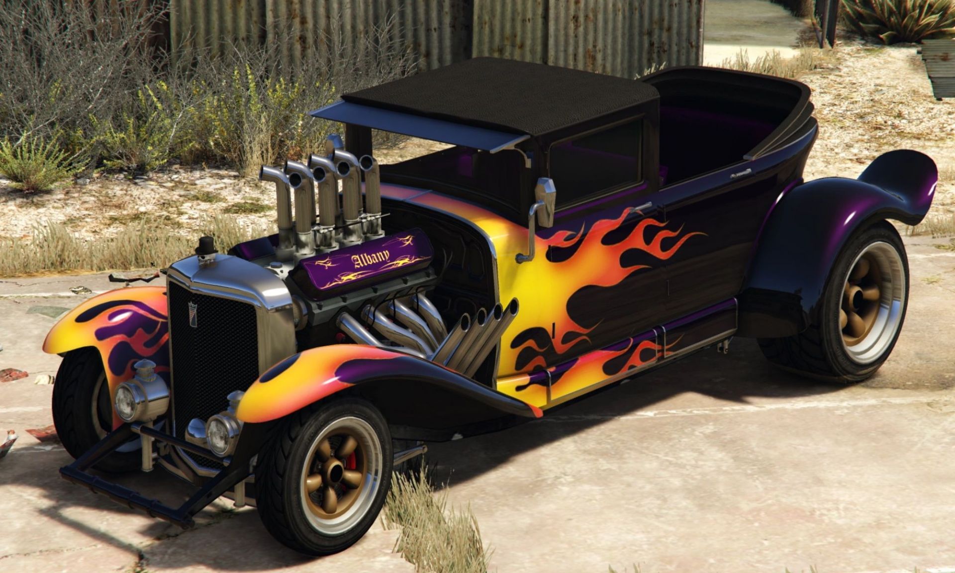 One of the more fun vehicles is the Albany Fränken Stange. It's a classic hot rod with a distinctive purple color. The Fränken Stange is a really fun vehicle to drive around. More importantly, it stands out as a sports classic.
