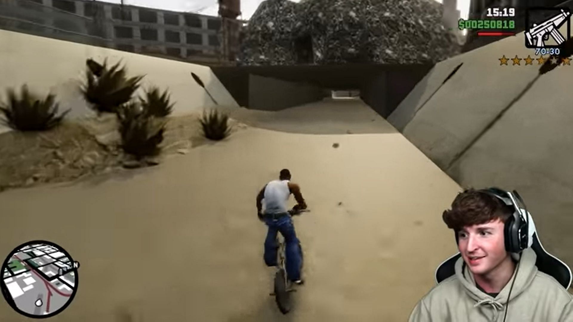 In his latest video, Caylus played around in GTA San Andreas Definitive Edition. He planned to evade the maximum wanted level in the game for 24 in-game hours and started the video with the max wanted level cheat, along with finding a BMX to ride.