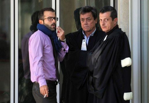 Antoine Camus (L), lawyer of Jeny Priez, partner of Montpellier’s French player Luka Karabatic, Jean-Robert Nguyen Phung (C) and Michael Corbier (R), lawyers of Montpellier’s players Nikola and Luka Karabatic are seen at Montpellier’s courthouse.