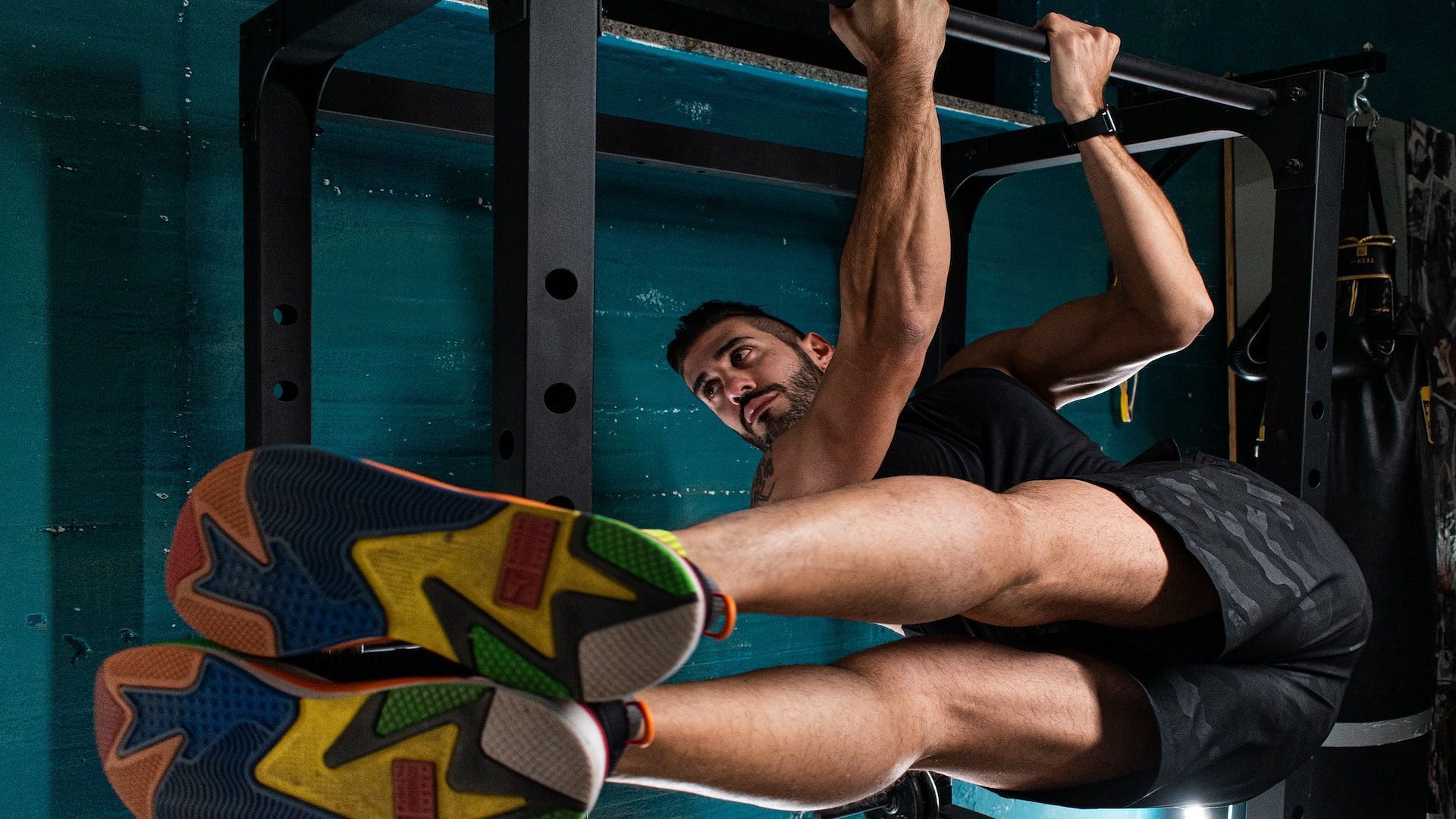 • Start by grabbing on to the bar and hanging by your hands. Keep your core muscles tight to avoid swaying and your legs from flailing around. Take a breath in.