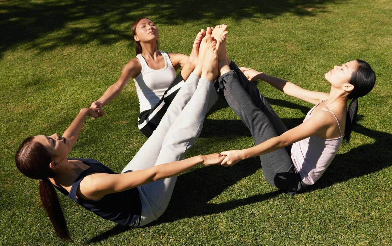 The triple boat pose is done by the partners sitting face to face, with their legs extended and toes touching. They interlock their arms and lean back, simultaneously lifting their legs off the ground, finding balance as a group.