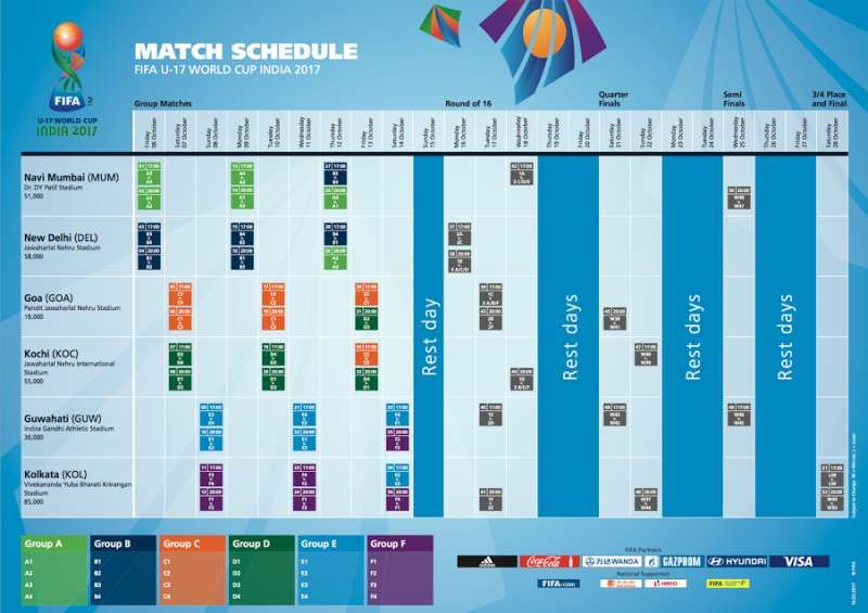 FIFA and the Local Organising Committee (LOC) have finally announced a 22-days long schedule for the U-17 World Cup. The tournament will commence on October 6 and four matches, two each from Group A and B, will be played on the day. 24 teams will be divided into six groups of four each. While Navi Mumbai will host the Group A matches, New Delhi will stage Group B, Goa and Kochi Group C and Group D, Guwahati and Kolkata Group E and Group F.