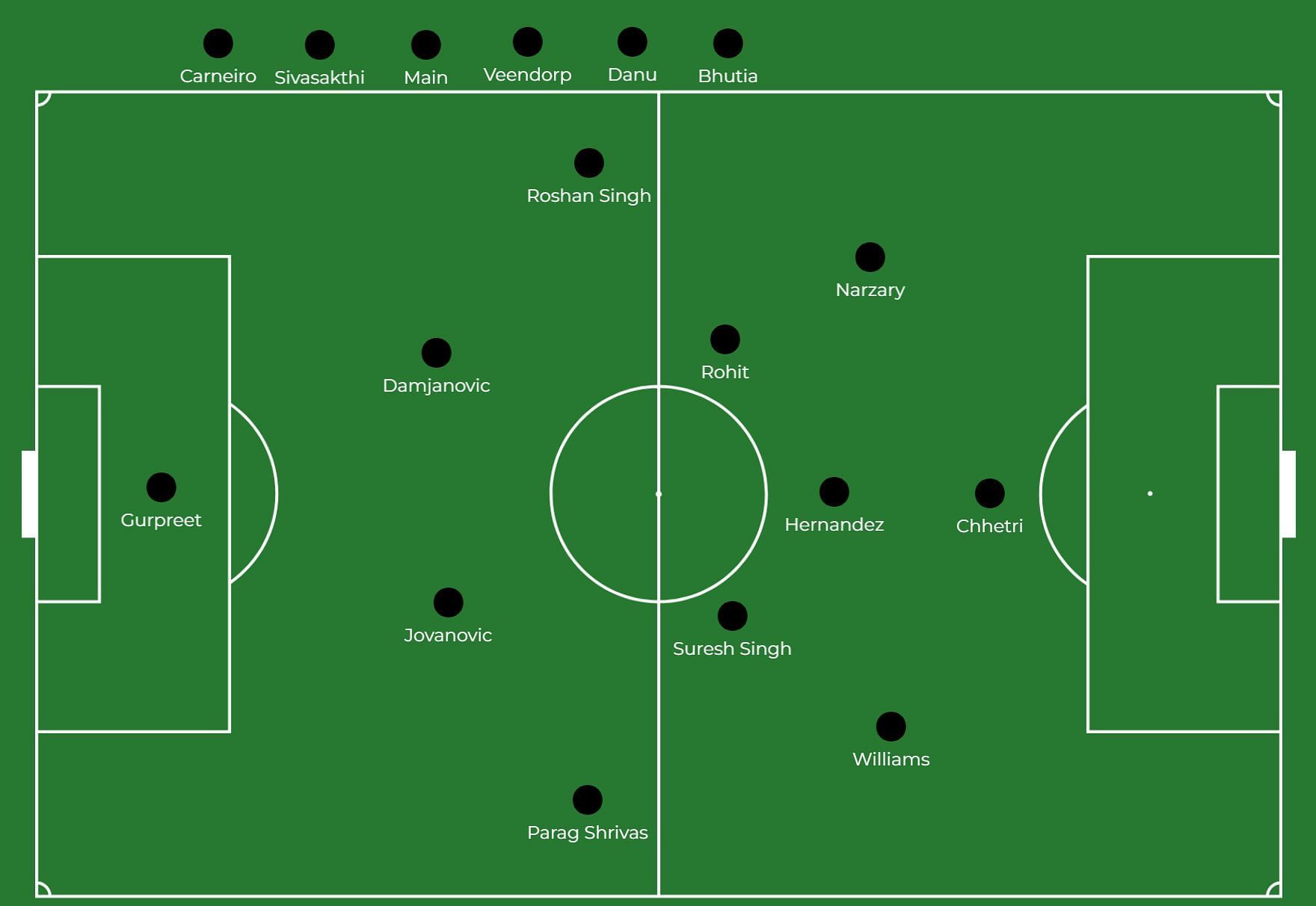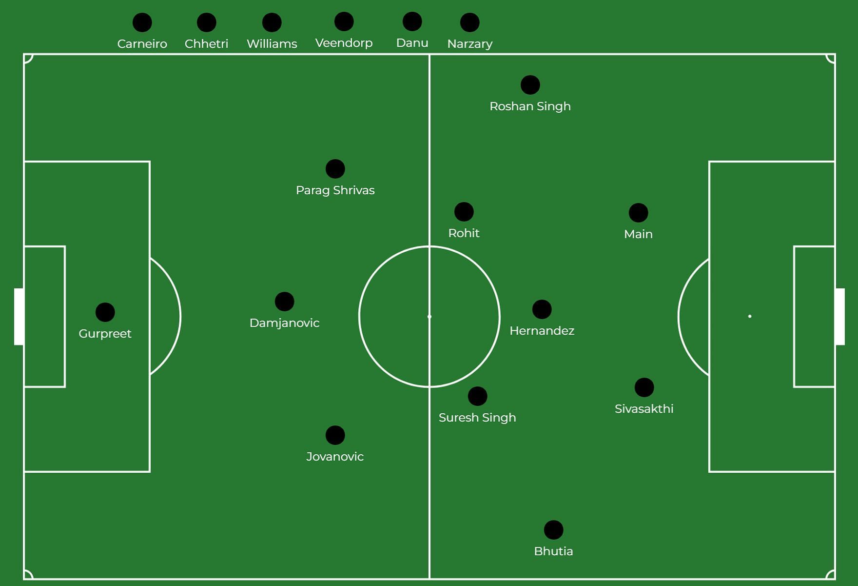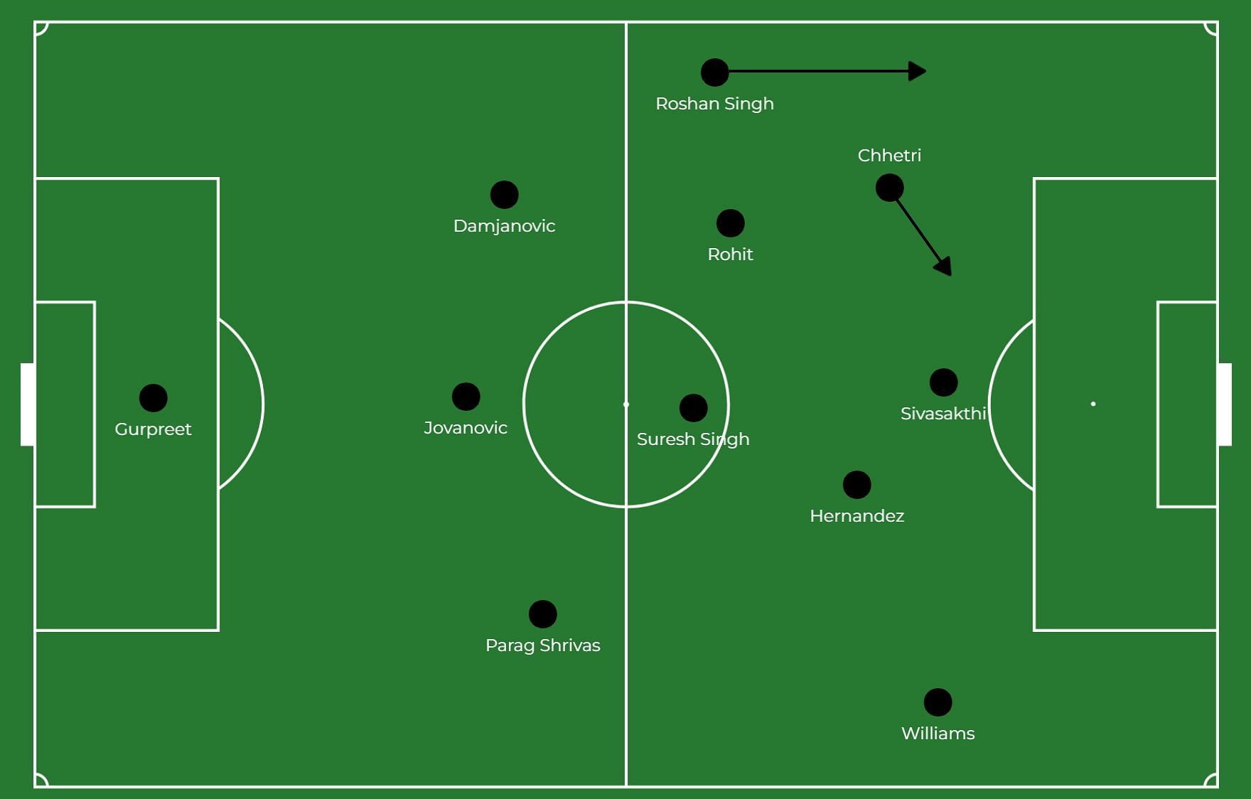 In possession, Naorem Roshan Singh's natural attacking instincts can be utilized to attack the byline, with Narzary (or Chhetri) drifting inside to support the striker.
