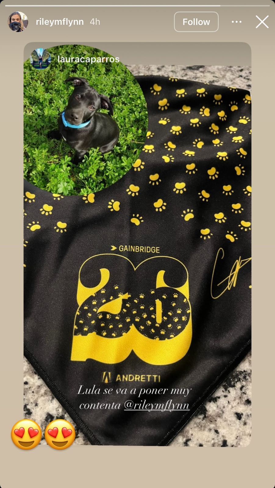 Andretti Global's star, Colton Herta's girlfriend, Riley Flynn, recently reshared an Instagram story from her friend. Flynn reacted to her friend expressing gratitude to the couple for their gifts, noting that the latter's pet dog will enjoy the Andretti-branded bandanas given by Herta and Flynn.