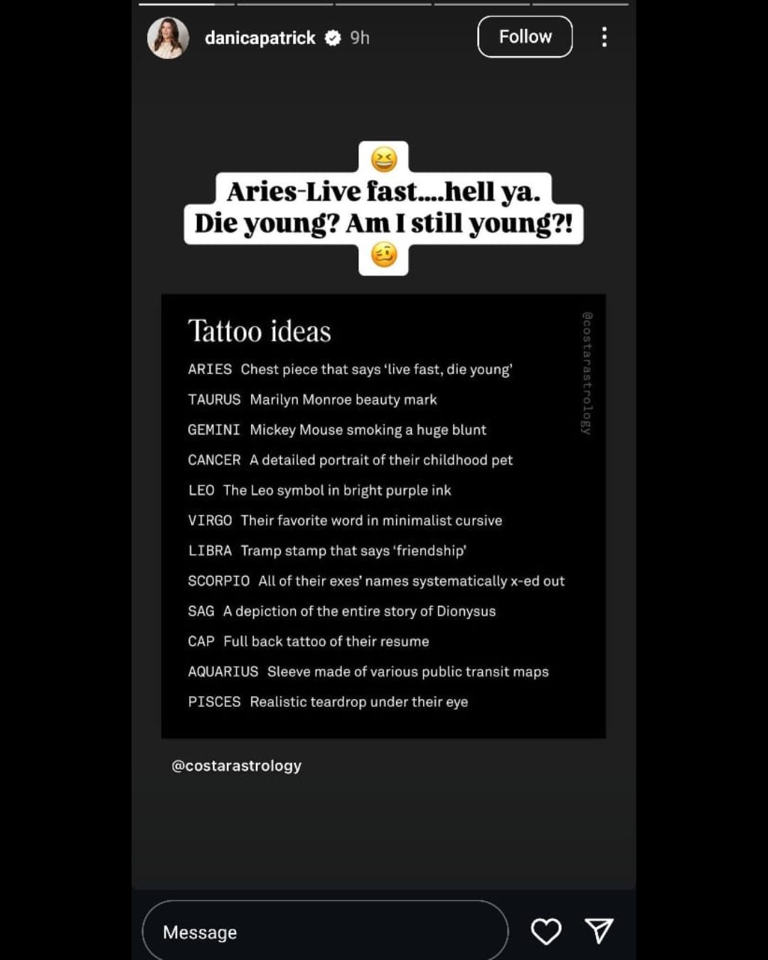 Danica Patrick shared a post that mentioned which zodiac sign should get which tattoo specifically. Patrick pointed out to her zodiac sign, Aries, which said people under that sign need to get a 'live fast, die young' tattoo on their chest. The 43-year-old posted the story with the caption: