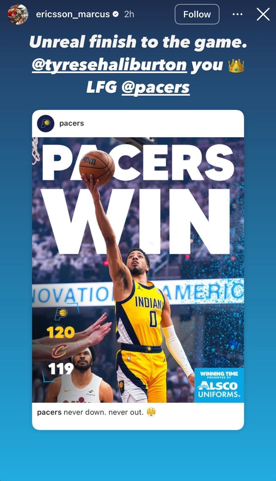 IndyCar driver Marcus Ericsson reshared an Indiana Pacers post to share his excitement after their nail-biting win over the Cleveland Cavaliers. He especially appreciated the game changer of the night, Tyrese Haliburton.